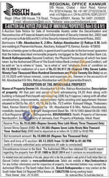 All that part and parcel of land admeasuring 24.20 Ares along with building in Kolayad Panchayath admeasuring 3200 Sq.ft (approx.) along with all other constructions, improvements, easementary rights existing and appurtenant thereon situated in Old Sy No. 45/1, 49/18, Re Sy No. 75/3 within Kolayad Village, Thalassery Taluk, Kannur District and owned by Mr. Aboobacker K & Mrs. Rabiya Aboobacker, morefully described in Jenmam Assignment Deed No. 1914/1993 dated 04-08-1993 of Sub Registrar Office Kuthuparamba. BOUNDARIES: North: Property of Vamanan Namboothiri, South: Property of Jameela, East: Property of Kadeeja, West: Road
