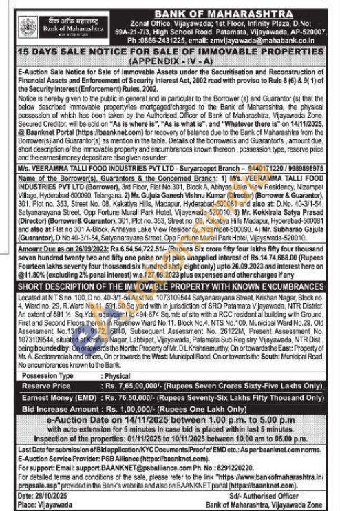 Located at NTS no. 100, О по. 40-3/1-54 Asst No. 1073109544 Satyanarayana Street, Krishan Nagar, Block no. 4. Ward no. 29, R.Ward No. 11, 591.50 Sq yard with in jurisdiction of SRO Patamata Vijayawada, NTR District. An extent of 591 % Sq. Yds. equivalent to 494-674 Sq.mts of site with a RCC residential building with Ground, First and Second Floors therein in Revenew Ward No. 11. Block No.4, NTS No. 100, Municipal Ward No.29, Old Assessment No.13191, 9172, 6840, Subsequent Assessment No. 26122M, Present Assessment No. 1073109544, situated at Krishna Nagar, Labbipet, Vijayawada, Palamata Sub Registry, Vijayawada, NTR Dist., being bounded by: On or towards the North: Property of Mr. DLKrishnamurthy, On or towards the East: Property of Mr. A. Seetaramaiah and others, On or towards the West: Municipal Road, On or towards the South: Municipal Road. No encumbrances known to the Bank