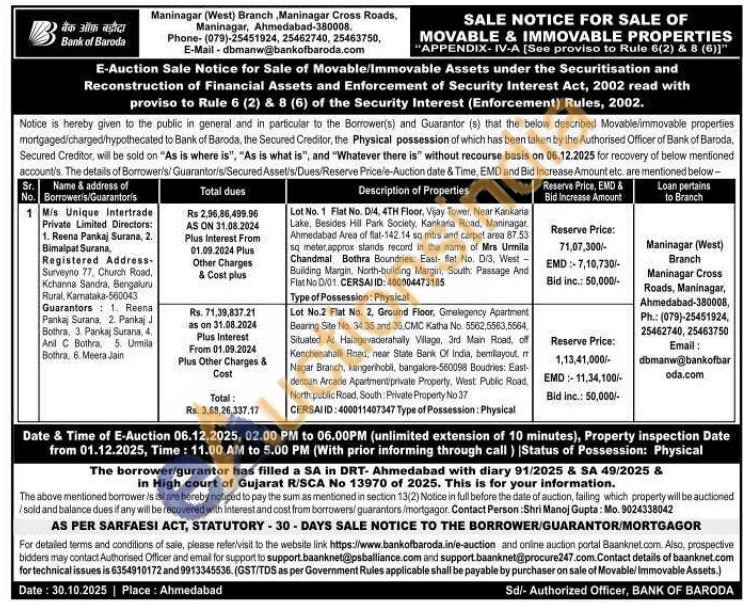 Lot No. 1 Flat No. D/4, 4TH Floor, Visay Tower, Near Kankaria Lake, Besides Hill Park Society, Kankaria Road, Maninagar Ahmedabad Area of flat-142.14 sq mirs and carpet area 87.53 sq meter, approx stands record in the name of Mrs Urmila Chandmal Bothra Boundries: East- flat No. D/3, West Building Margin, North-building Margin, South: Passage And Flat No D/01. CERSAJ ID: 400004473185