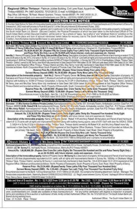 2) Name of Property Owner Raleef KM and Ancy Raleet: All that plece and Parcel of land having an extent of 12.75 cents with all rights and improvements thereon along with building having approx. area of 4701 Sqft with door No 5624-2, 5624-3. 5/624-4 in Sy No.512/2p in Otukkara village, Thrissur Taluk. Thrissur distid owned by Mr.Raleel KM. and Mrs. Ancy Rsieel more fully mentioned in Sale Deed No 4254/07 dated 01.09.2017 registered at Sub Registrar Office Olukkara, Thrissur District and bounded as follows (As per primary Title deed). North Property of Nesk South Property of Abdul Khader. East Road, West: Property of Kunjalimn