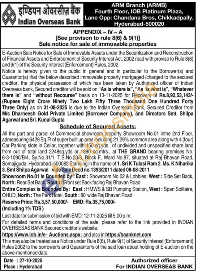 All the part and parcel of Commercial showroom property Showroom No.01 inthe 2nd Floor, admeasuring 6429 Sq. Ft of super built up area including 21.29% common area along with 4 (four) Car Parking slots in Cellar, together with 150 sq.yds., of undivided and unspecified share land from out of total land 2248sq.yds or 1880 sq.mtrs., at THE GRAND bearing premises No. 6-3-1090/B/4, Sy.No.31/1, T.S.No.20/3, Block F, Ward No.87, situated at Raj Bhavan Road, Somajiguda, Hyderabad-500082 Standing in the name of 1. Sri K Tulasi Ram 2. Ms. K Niharika 3. Smt Shilpa Agarwal vide Sale Deed no. 1393/2011 dated 08-08-2011