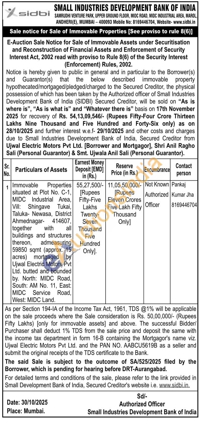 Immovable Properties situated at Plot No. C-1, MIDC Industrial Area, Vill: Shingave Tukai, Taluka- Newasa, District Ahmednagar- 414607, together with all buildings and structures thereon, admeasuring 59850 sqmt (approx. 15 acres) mortgaged by Ujwal Electric Motors Pvt Ltd. butted and bounded by. North: MIDC Road, South: AM No. 11, East: MIDC Service Road, West: MIDC Land.