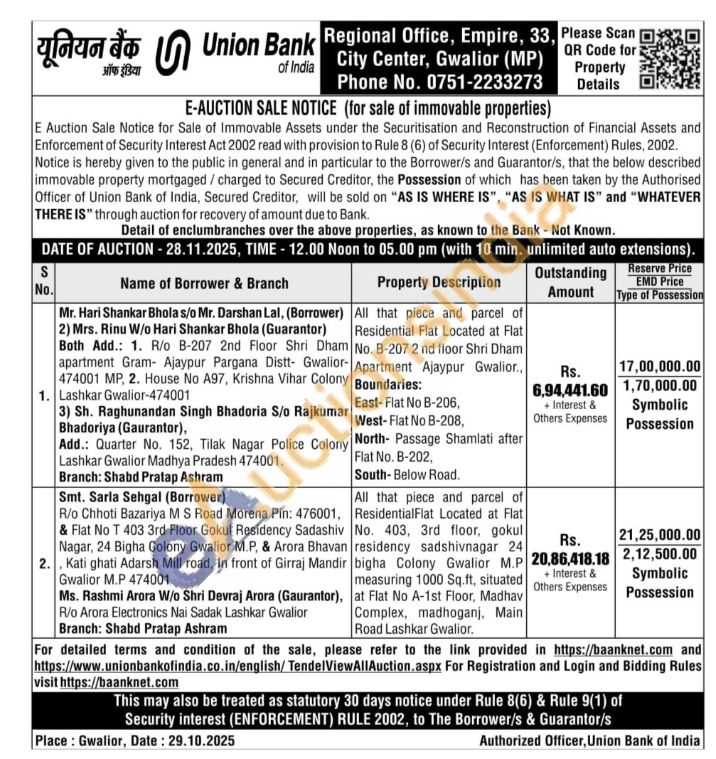 2) All that piece and parcel of Residential Flat Located at Flat No. 403, 3rd floor, gokul residency sadshivnagar 24 bigha Colony Gwalior M.P measuring 1000 Sq.ft, situated at Flat No A-1st Floor, Madhav Complex, madhoganj, Main Road Lashkar Gwalior