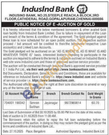 IndusInd Bank Gold Auctions Auction in Chennai