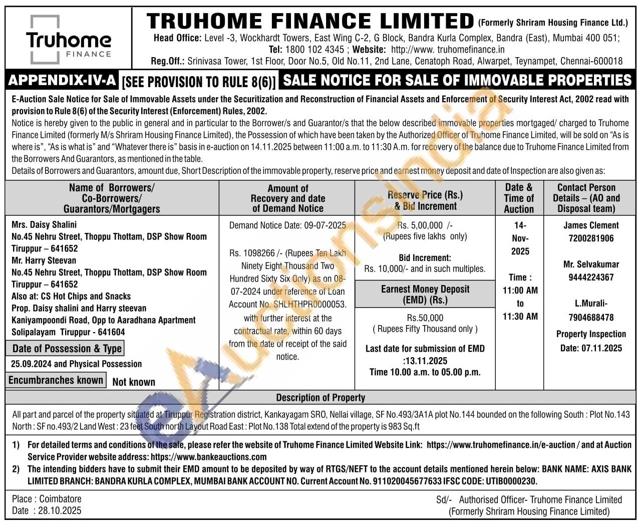 All part and parcel of the property situated at Tiruppur Registration district, Kankayagam SRO, Nellai village, SF No.493/3A1A plot No. 144 bounded on the following South: Plot No.143 North: SF no.493/2 Land West: 23 feet South north Layout Road East: Plot No. 138 Total extend of the property is 983 Sq.ft