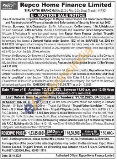 Al that piece and parcel of land and building in Chittoor District-Sri Balaji Registration District-Tirupati Sub-District-Tirupati Urban Mandalam-Tirupati Town-19 th Ward-Bairagipatteda Area-Tirupati Village Accounts Survey's Nos. 241/18,283-RC.C. Building-Old D.No. 15-12-105, New D.No.19-45-M3-669 Sounded on East: Plot No. 106, West Plot No. 104, North Extinction House, South Road in between this East to West 60 feet or 18.300 meter North to South 40 feet or 12.200 Meter Admeasuring total an extent of 2400 Sq.ft or 266.66 Sq. Yards. In this R.C.C Building with Old D No.19-12-105, New D No. 19-45-M3-669 with Doors, Windows, Electrical Fittings etc. Vide Assessment No. 1012022828.