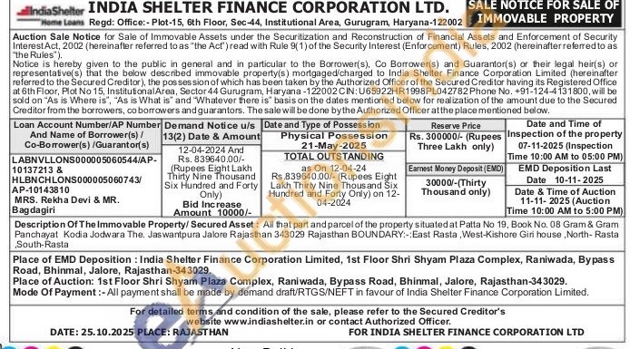 Description Of The Immovable Property/Secured Asset: All that part and parcel of the property situated at Patta No 19, Book No. 08 Gram & Gram Panchayat Kodia Jodwara The. Jaswantpura Jalore Rajasthan 343029 Rajasthan BOUNDARY:-:East Rasta, West-Kishore Giri house, North- Rasta South-Rasta