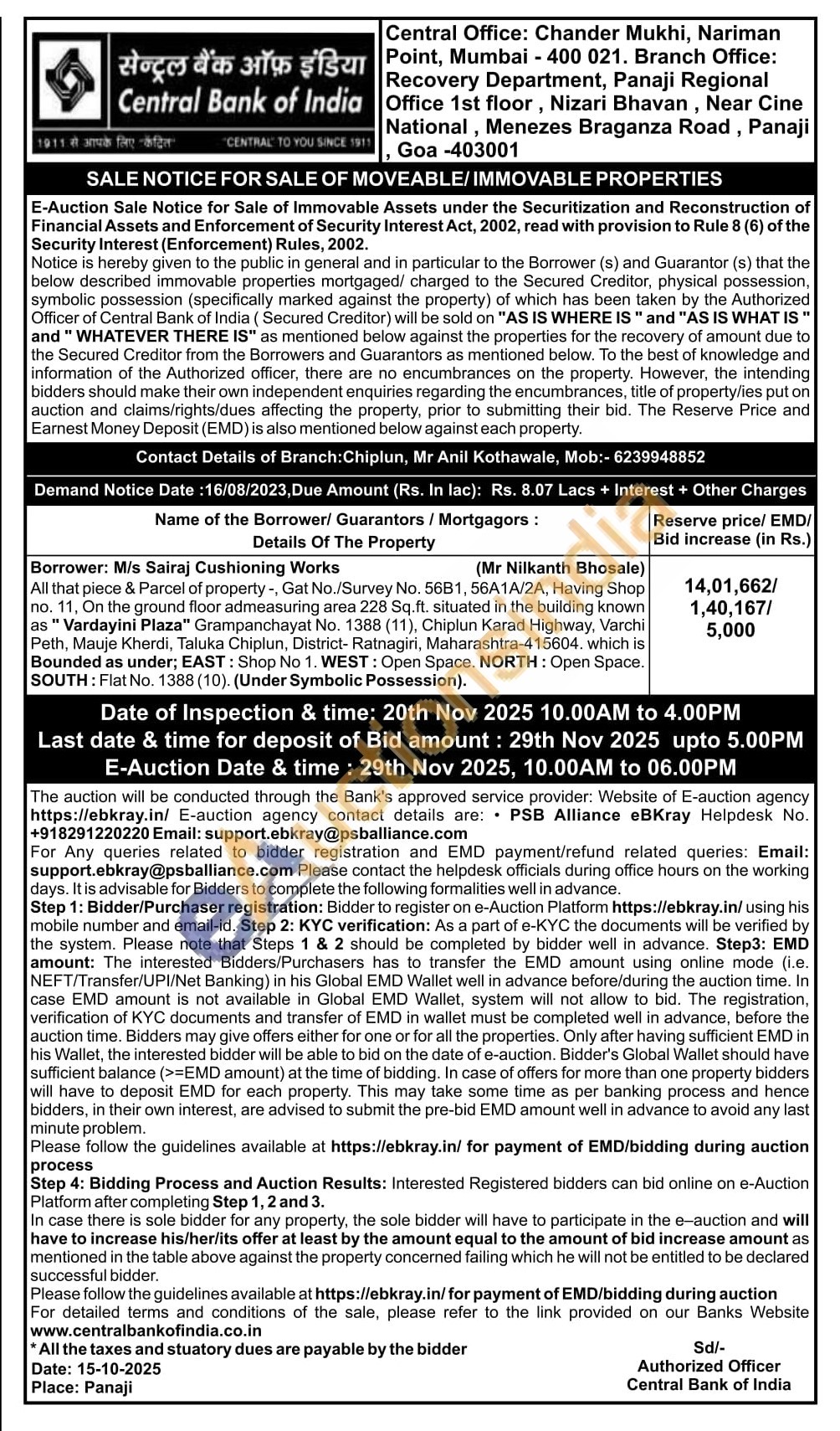 All that piece & Parcel of property, Gat No./Survey No. 56B1, 56A1A/2A, Having Shop no. 11, On the ground floor admeasuring area 228 Sq.ft. situated in the building known as "Vardayini Plaza" Grampanchayat No. 1388 (11), Chiplun Karad Highway, Varchi Peth, Mauje Kherdi, Taluka Chiplun, District- Ratnagiri, Maharashtra-415604, which is Bounded as under; EAST: Shop No 1. WEST: Open Space. NORTH: Open Space. SOUTH: Flat No. 1388 (10). (Under Symbolic Possession
