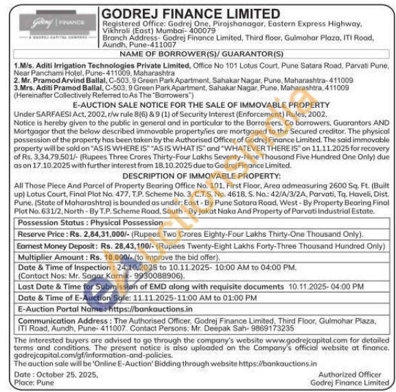 All Those Piece And Parcel of Property Bearing Office No. 101, First Floor, Area admeasuring 2600 Sq. Ft. (Built up) Lotus Court, Final Plot No. 477, T.P. Scheme No. 3, C.T.S. No. 4618, S. No.: 42/A/3/2A, Parvati, Tq. Haveli, Dist. Pune. (State of Maharashtra) is bounded as under: East-By Pune Satara Road, West-By Property Bearing Final Plot No. 631/2, North-By T.P. Scheme Road, South By Jakat Naka And Property of Parvati Industrial Estate.