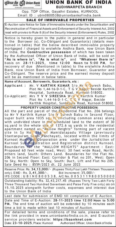 All the part and parcel of the Residential Flat No. 206 belongs to Mr V Karthik Kumar S/o V Suresh Babu in Second Floor, super built area 1035 sq. ft (including common area) along with undivided share in the scheduled land to the extent of 30 sq.yard in the whole site of 1372.6 sq yards in the residential apartment named as "Mallow Heights" forming part of vacent site in Sy No. 116 of Mamidalapadu Village (previously Stantanpuram Gram Panchayat), located within the limits of Kurnool Municipal Corporation area under the Jurisdiction of Kurnool Sub-Registration and Registration district Kurnool. Boundaries for the "MALLOW HEIGHTS" Apartment: East: Proposed 60 feet wide road, West: 30 feet wide Road, North: others land, South: Others Land. Boundaries for the Flat No. 206 in Second Floor: East: Corridor & Flat no 201, West: Open to Sky, North: Open to Sky, South: Duct, Lift and Flat No 205. Sale Deed No 8559/2023 dt. 22 June 2023