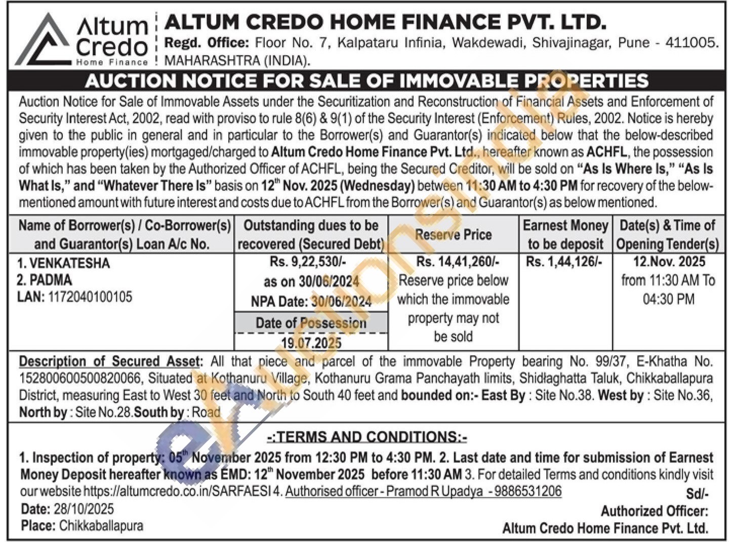 Description of Secured Asset: All that piece and parcel of the immovable Property bearing No. 99/37, E-Khatha No. 152800600500820066, Situated at Kothanuru Village, Kothanuru Grama Panchayath limits, Shidłaghatta Taluk, Chikkaballapura District, measuring East to West 30 feet and North to South 40 feet and bounded on:- East By: Site No.38. West by: Site No.36, North by: Site No.28. South by: Road