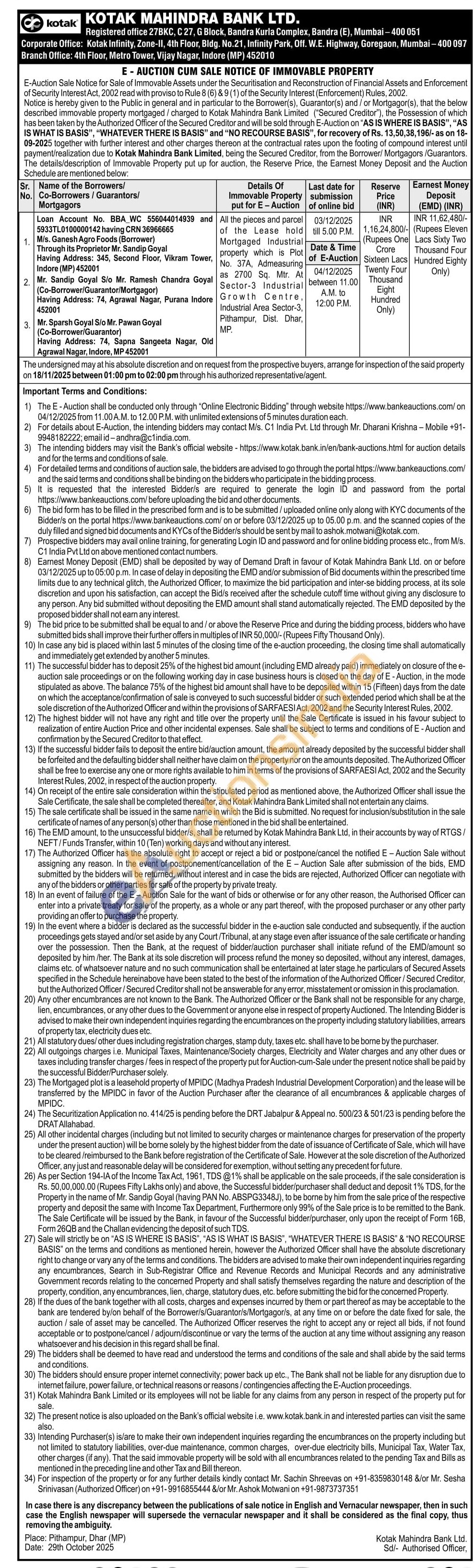 All the pieces and parcel of the Lease hold Mortgaged Industrial property which is Plot No. 37A, Admeasuring as 2700 Sq. Mtr. At Sector-3 Industrial Growth Centre, Industrial Area Sector-3, Pithampur, Dist. Dhar, MP.