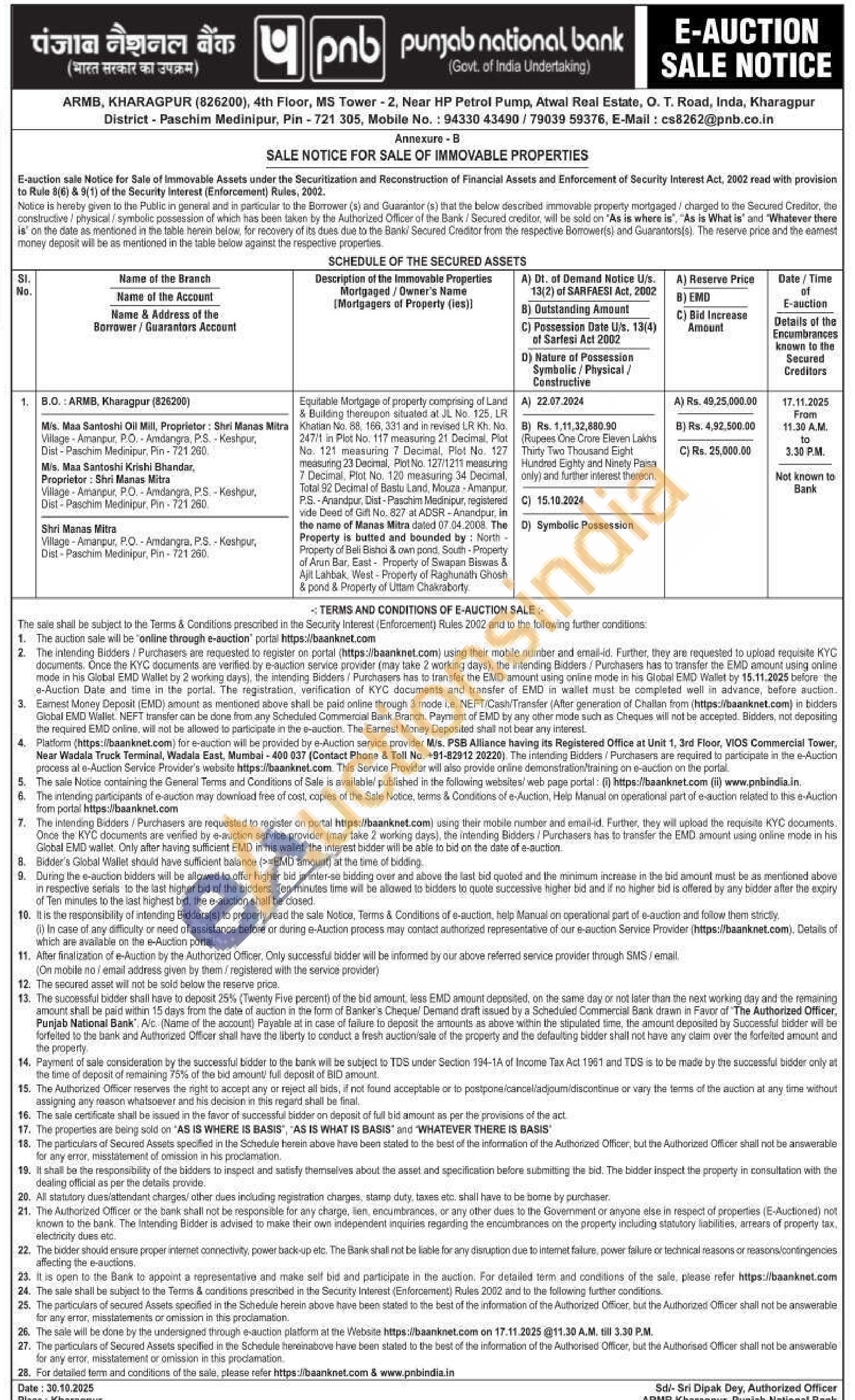 Equilatie Mortgage of property comprising of Land & Building thereupon staated at No. 125, LR Khatan No. 88 188 321 and in revised LR Kh. No 26771 in Plot No. 117 measuring 21 Decimal, Plat No. 121 measuring 7 Decimal, Plot No. 127 measuring 23 Decimal, Plert No. 127/1211 measuring 7 Decimal, Plot No. 120 measuring 34 Decimal Total 62 Decimal of Bastu Land, Moura Amanpur P-Avundpur, Dist-Paschim Medinipur, reglene vide Dead of Off No. 027 at ADSR-Anandpur, In the name of Manas Mitra doted 07.04.2008. The Property is butted and bounded by North-Property of Bali Bahi & own pond South-Property of Arun Bar. East Property of Swapan Biswas & Alt Lanbal, West-Progerty of Raghunath Ghosh & pond & Property of Uttam Chakraborty