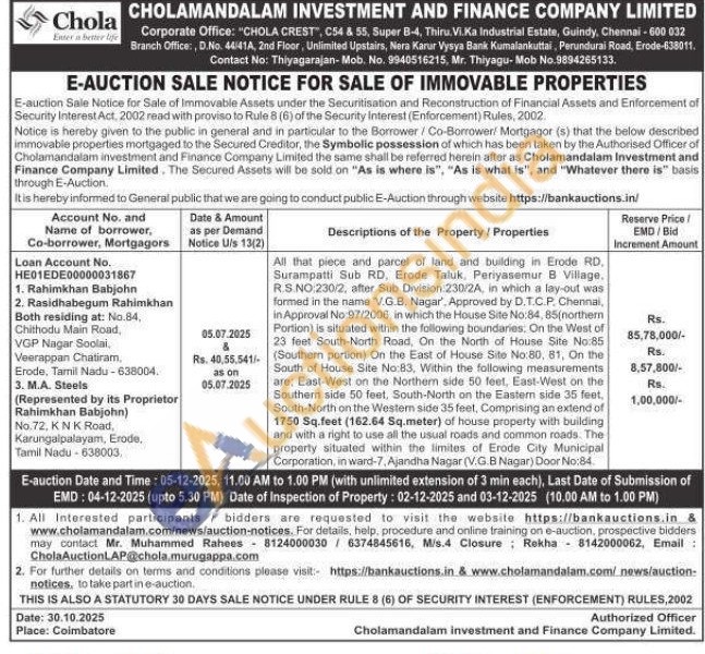All that piece and parcel of land and building in Erode RD, Surampatti Sub RD. Erode Taluk, Periyasemur B Village, R.S. NO:230/2, after Sub Division 230/2A, in which a lay-out was formed in the name "V.G.B. Nagar, Approved by D.T.C.P. Chennai, in Approval No:97/2006, in which the House Site No:84, 85(northem Portion) is situated within the following boundaries, On the West of 23 feet South-North Road, On the North of House Site No:85 (Southern portion) On the East of House Site No:80, 81, On the South of House Site No:83, Within the following measurements are: East-West on the Northern side 50 feet, East-West on the Southern side 50 feet, South-North on the Eastern side 35 feet, South-North on the Western side 35 feet, Comprising an extend of 1750 Sq.feet (162.64 Sq.meter) of house property with building and with a right to use all the usual roads and common roads.. The property situated within the limites of Erode City Municipal Corporation, in ward-7, Ajandha Nagar (V.G.B Nagar) Door No:84