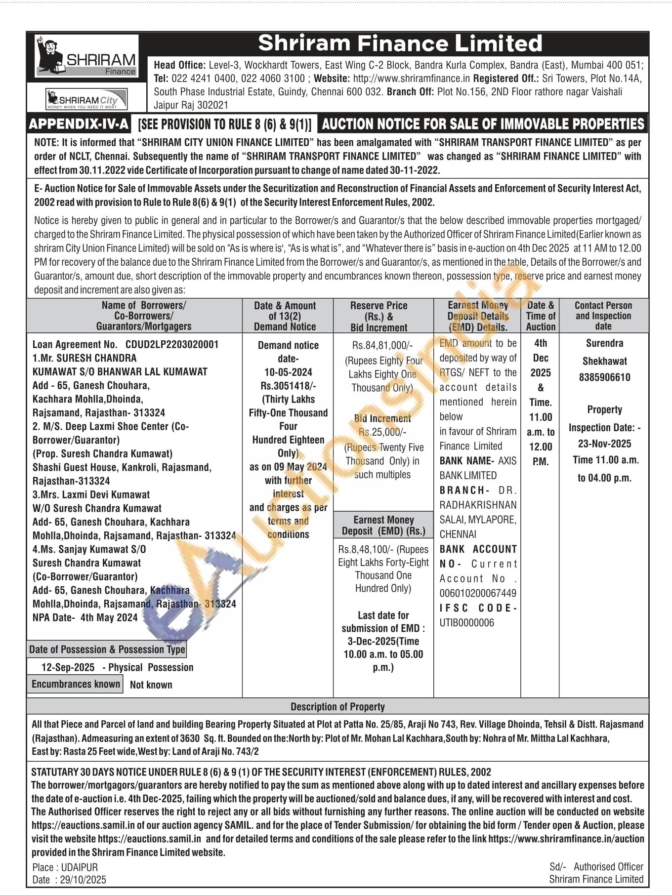 All that Piece and Parcel of land and building Bearing Property Situated at Plot at Patta No. 25/85, Araji No 743, Rev. Village Dhoinda, Tehsil & Distt. Rajasmand (Rajasthan). Admeasuring an extent of 3630 Sq. ft. Bounded on the:North by: Plot of Mr. Mohan Lal Kachhara, South by: Nohra of Mr. Mittha Lal Kachhara, East by: Rasta 25 Feet wide, West by: Land of Araji No. 743/2