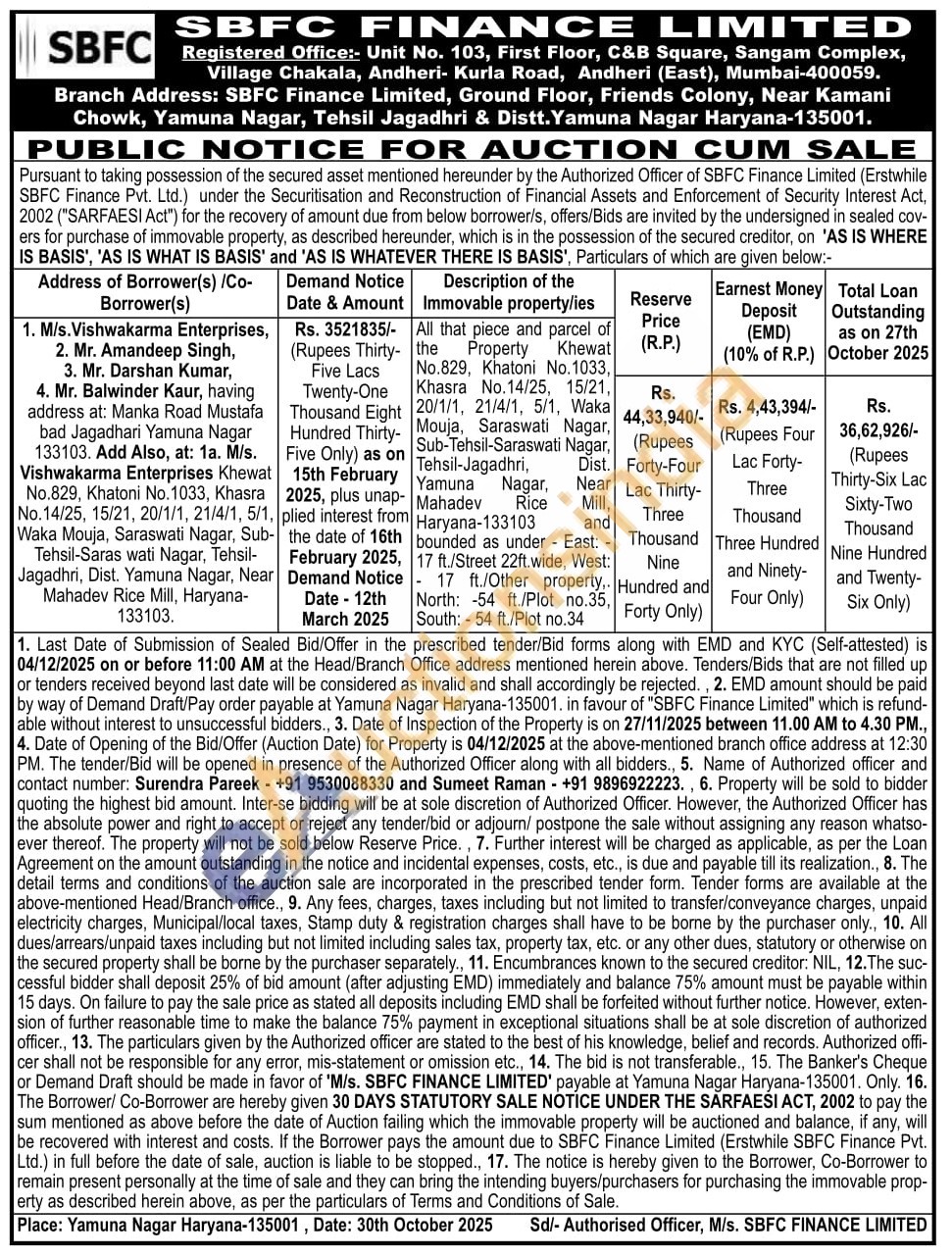 All that piece and parcel of the Property Khewat No.829, Khatoni No.1033, Khasra No.14/25, 15/21, 20/1/1, 21/4/1, 5/1, Waka Sub Tehsil-Saraswati Nagar Tehsil-Jagadhri, Mouja, Saraswati Nagar, Dist. Yamuna Nagar, Near Rice Mill, and Mahadev Haryana-133103 bounded as under - East: 17 ft./Street 22ft.wide, West: 17 ft./Other property, North: -54 ft./Plot no.35, South: 54 ft./Plot no.34