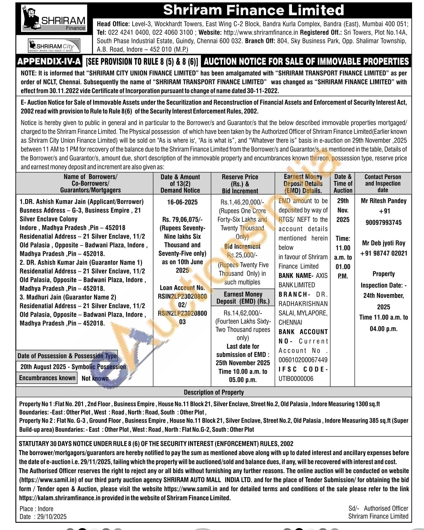 Property No 1: Flat No. 201, 2nd Floor, Business Empire, House No. 11 Block 21, Silver Enclave, Street No.2, Old Palasia, Indore Measuring 1300 sq.ft Boundaries: -East: Other Plot, West: Road, North: Road, South: Other Plot, Property No 2: Flat No. G-3, Ground Floor, Business Empire, House No.11 Block 21, Silver Enclave, Street No.2, Old Palasia, Indore Measuring 385 sq.ft (Super Build-up area) Boundaries: - East: Other Plot, West: Road, North: Flat No.G-2, South: Other Plot
