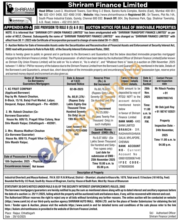 Industrial Diverted Land Mauza Kodewal, P.H.N. 031 R.N.M Kurud, District-Dhamtari, situated in Khasra No. 1079, Total area 0.15 hectare (16140 Sq. Feet) Bounded North By: CC Road, South By: House of Bhagiram, East by: House of Budh Ram, West By: House of Bhanuram