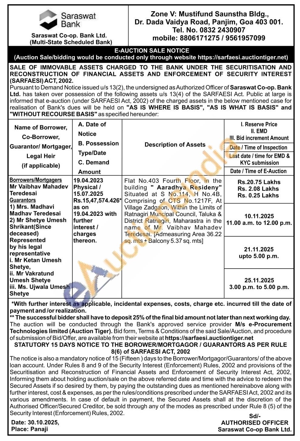 Flat No.403 Fourth Floor, in the building" Aaradhya Resideny" Situated at S No.114, Η Νο.4B, Comprising of CTS No.1217F, At Village Zadgaon, Within the Limits of Ratnagiri Muncipal Council, Taluka & District Ratnagiri, Maharastra in the name of Mr. Vaibhav Mahadev Teredesai. [Admeasuring Area 36.22 sq. mts + Balcony 5.37 sq. mts