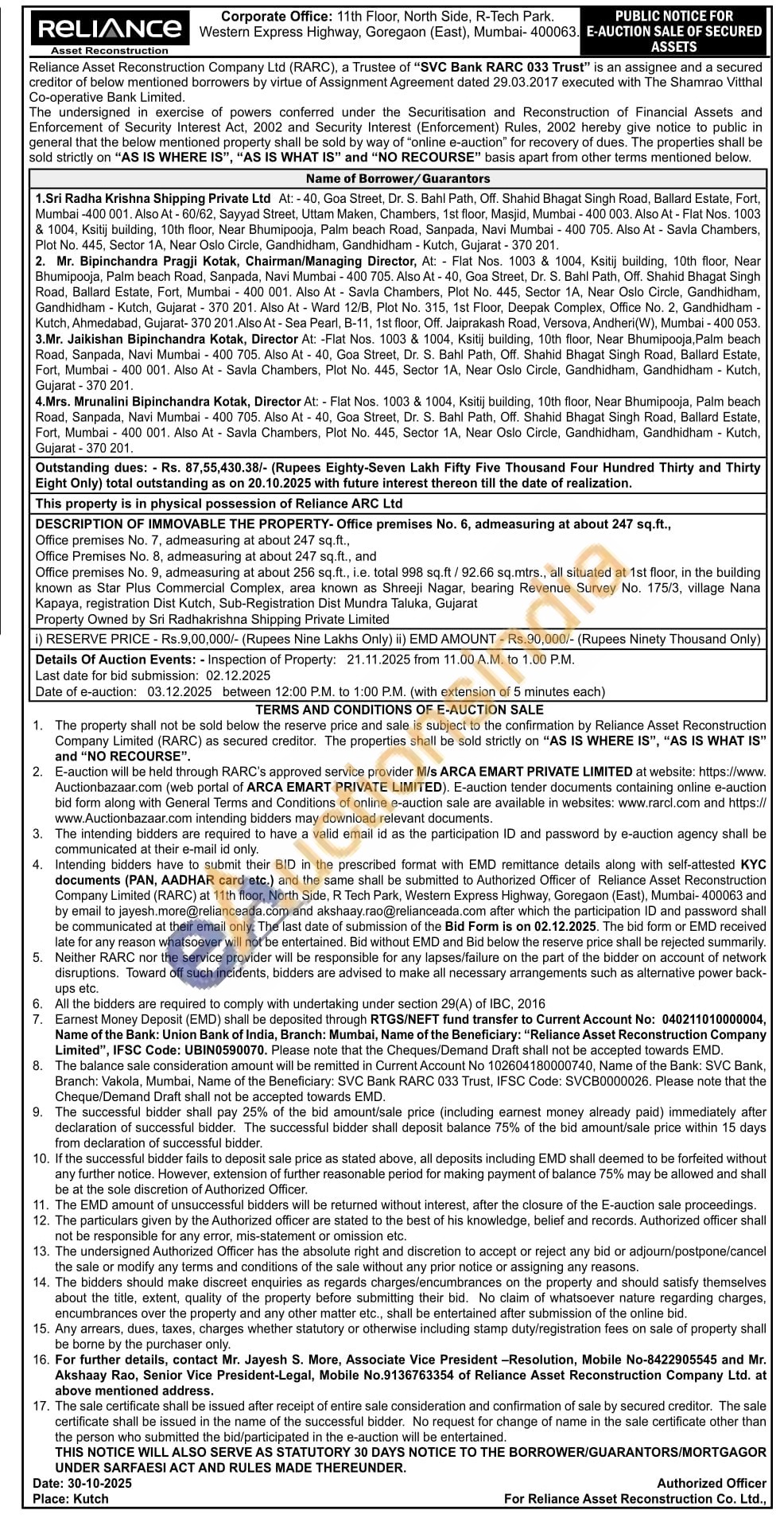 Office premises No. 6, admeasuring at about 247 sq.ft., Office premises No. 7, admeasuring at about 247 sq.ft., Office Premises No. 8, admeasuring at about 247 sq.ft., and Office premises No. 9, admeasuring at about 256 sq.ft., i.e. total 998 sq.ft/92.66 sq.mtrs., all situated at 1st floor, in the building known as Star Plus Commercial Complex, area known as Shreeji Nagar, bearing Revenue Survey No. 175/3, village Nana Kapaya, registration Dist Kutch, Sub-Registration Dist Mundra Taluka, Gujarat Property Owned by Sri Radhakrishna Shipping Private Limited