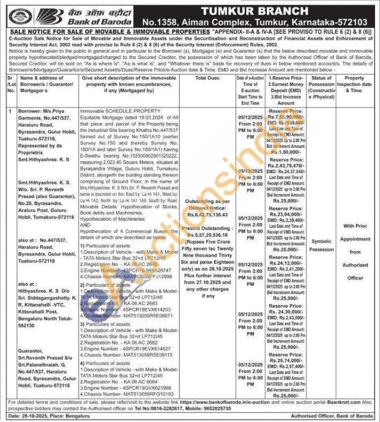 Equitable Mortgage dated 19.03.2024 of All that piece and parcel of the Property being the industrial Site bearing Khatha No. 447/537 formed out of Survey No 150/1A10 (earlier Survey No 150 and thereby Survey No. 150/1A and later Survey No. 150/1A1) having E-Swathu bearing No.152500902901320222 measuring 2,023.40 Square Meters, situated at Byrasandra Village, Guluru Hobli, Tumakuru District, alongwith the building standing thereon comprising of Ground Floor, in the name of Mrs. Henyashree. K. S Wo Sn. Revanth Prasad and same is bounded on the East by: La Hi 1A1, West by La Hi 1A2, North by: La Hi 1A1 149, South by: Road Movable Details: Hypothecation of Stocks Book debts and Machineries Hypothecation of Machineries AND Hypothecation of 4 Commercial Buses, the details of which are described as below
