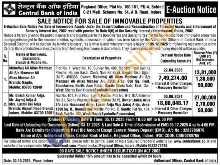 Plot No. 1, Ward No. 16, Survey No. 488, Mohalla Patel Gali Ke Peeche, Harijan Basti, Chote Nale Ke Baad, Nagda, Dist. Ujjain (M.P.) 456335, Owner: Mehathuj Ali Alias Mehfooz Ali S/o Mansoor Ali Alias Mansur Ali, Total Area: 600 Sq. Feet, Boundaries: North: Aam Rasta, South: Chota Nala, East: Gali, West: Sharda Devi House (Symbolic Possession)