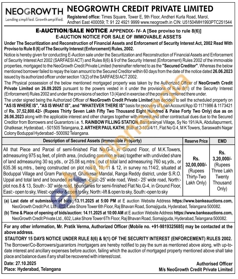 All that Piece and Parcel of semi-finished Flat No.G-4, in Ground Floor, of M.K.Towers, admeasuring 975 sq.feet, of plinth area, (including common areas) together with undivided share of land admeasuring 30 sq.yds., or 25.08 sq.mtrs., out of total land admeasuring 760 sq.yds., or 635.36 sq.mtrs., being constructed on plot nos.9, 10, 11 & 12, in survey no.114/2, situated at Boduppal Village and Gram Panchayat, Ghatkesar Mandal, Ranga Reddy district, under S.R.O. Uppal and total land and bounded as follows:-East:-25' wide road, West:- 25' wide road, North:-plot nos.8 & 13, South:- 30' wide road, boundaries for semi-finished Flat No.G-4, in Ground Floor, East:-open to sky, West:-corridor & open to sky, North:-lift & open to sky, South:-open to sky