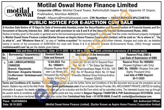 Door. No: 20-3/2-35/1H Second Floor Flat. No. Sf-1 "Sri Satya Sai Nilayam Main Road Ayodhaya Nagar R.S.No. 109 Plot. No. 67 Revenue Ward. No. 51 Near Khendhu Medical Shop Krishna Andhra Pradesh 520003