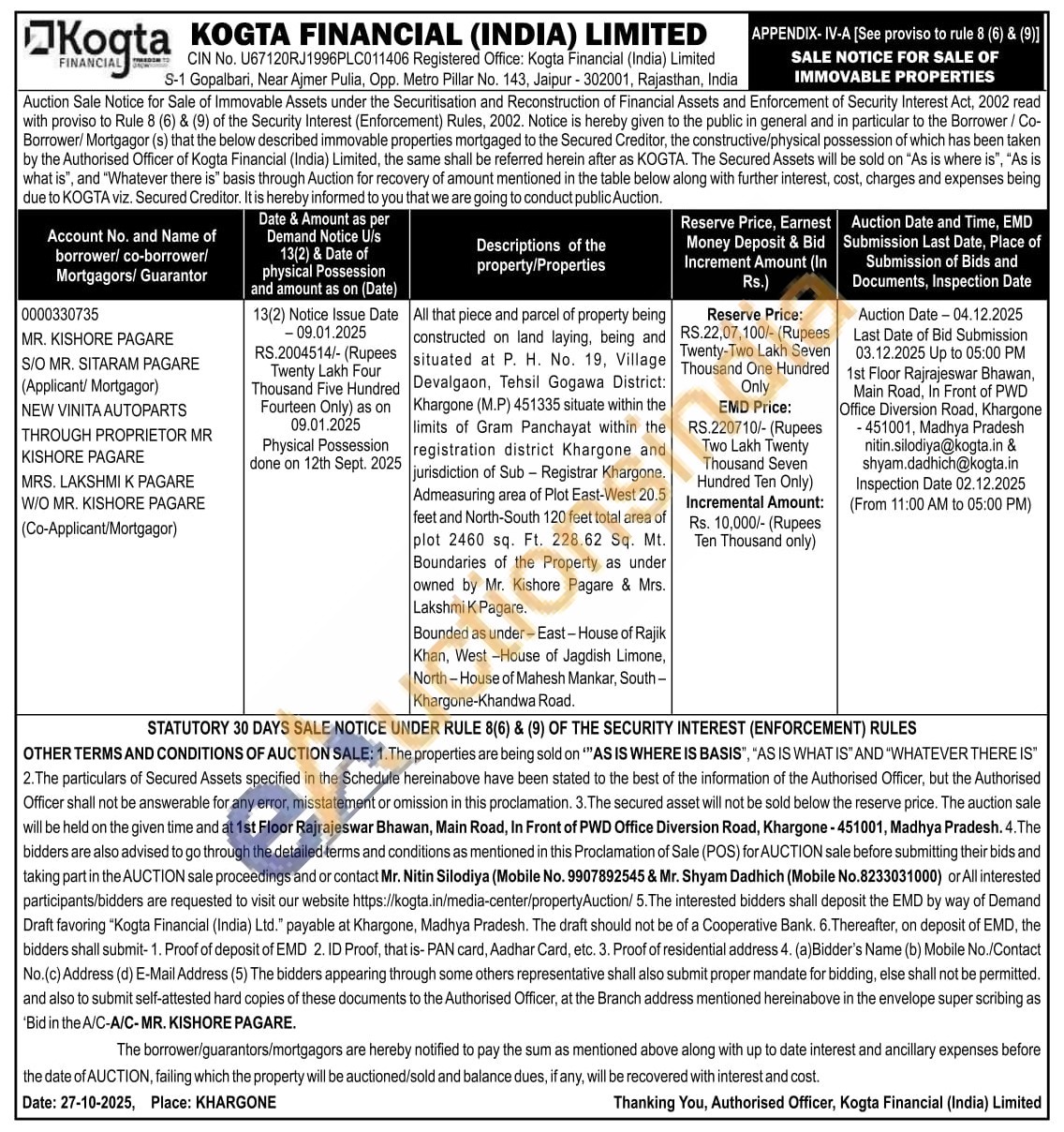 All that piece and parcel of property being constructed on land laying, being and situated at P. H. No. 19, Village Devalgaon, Tehsil Gogawa District: Khargone (M.P) 451335 situate within the limits of Gram Panchayat within the registration district Khargone and jurisdiction of Sub - Registrar Khargone. Admeasuring area of Plot East-West 20.5 feet and North-South 120 feet total area of plot 2460 sq. Ft. 228.62 Sq. Mt. Boundaries of the Property as under owned by Mr. Kishore Pagare & Mrs. Lakshmi K Pagare. Bounded as under-East-House of Rajik Khan, West-House of Jagdish Limone, North-House of Mahesh Mankar, South-Khargone-Khandwa Road