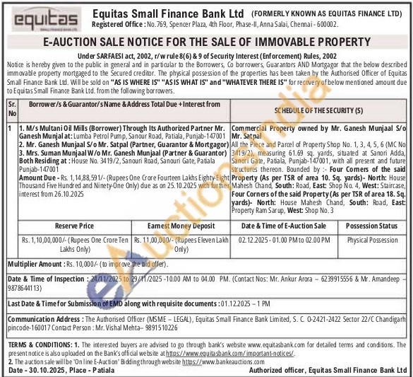 All the Piece and Parcel of Property Shop No. 1, 3, 4, 5, 6 (MC No 3419/2), measuring 61.69 sq. yards, situated at Sanori Adda, Sanori Gate, Patiala, Punjab-147001, with all present and future structures thereon. Bounded by Four Comers of the said Property (As per TSR of area 10. Sq. yards)- North: House Mahesh Chand, South: Road, East: Shop No. 4, West: Staircase, Four Corners of the said Property (As per TSR of area 18. Sq. yards) North: House Mahesh Chand, South Road, East: Property Ram Sarup, West: Shop No. 3
