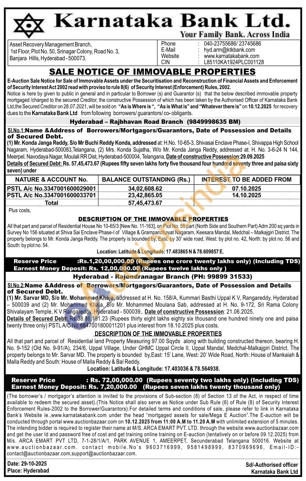 All that part and parcel of Residential land Property Measuring 97.00 Sqyds along with building constructed thereon, bearing H. No. 9-152 (Old No. 9-91/A), 234/6, Uppal Village, Under GHMC Uppal Circle II, Uppal Mandal, Medchal-Malkajgiri District. The property belongs to Mr. Sarvar MD. The property is bounded by, East: 15' Lane, West: 20' Wide Road, North: House of Mankaiah & Malla Reddy and South: House of Malla Reddy & Bal Reddy. Location: Latitude & Longitude: 17.403036 & 78.564938.