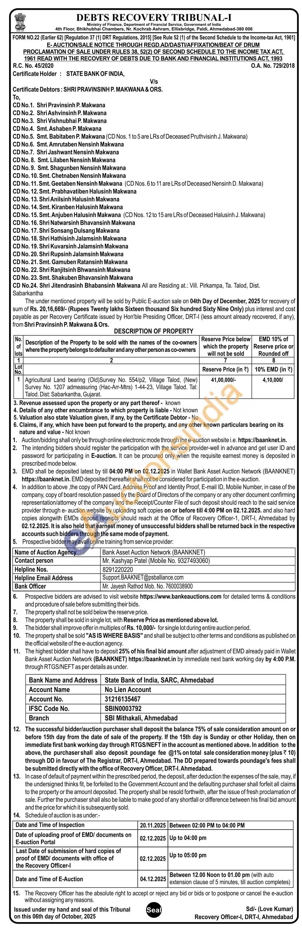 Agricultural Land bearing (Old)Survey No. 554/p2, Village Talod, (New) Survey No. 1207 admeasuring (Hac-Arr-Mtrs) 1-44-23, Village Talod. Tal: Talod. Dist: Sabarkantha, Gujarat
