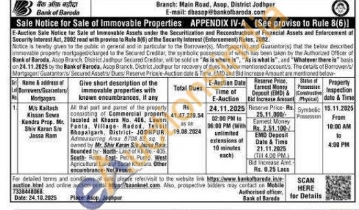 All that part and parcel of the property consisting of Commercial property located at Khasra No. 406. Lawari Fanta, Village Raded, Tehsil Bhopalgarh, District- JODHPUR Admeasuring Area 8708.82 af owned by Mr. Shiv Karan Sio Jassa Ram Bounded by North Land of Kh.No: 405 South Road East: Patrol Pump West Agricultural Land of Same Khasara. Other encumbrance-Not Known.