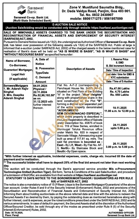 Flat No. A-F-2 (corresponding to Panchayat House No. 242/3 (AF-2), situated on First Floor of the Building "A" in the project "Akar Heights" along with proportionate share in the land constructed on the Plot "B", forming a distinct and separated part of the entire property denominated "AFORAMENTO SEM DENOMINACAO ESPECIAL", which entire property is described in the Land Registration office of Salcete under Description No. 45875 of book B no. 119 of New Series, enrolled in Mormugal Taluka Revenue office under Matriz No. 820 in respect of Sancoale Village. Admeasuring super built up area of 117.81 sq. mtrs. The said flat premises is bounded as: East:- By Lift, West:- By Flat No. AF-3. North: By Staircase Block and South:-By Open space.