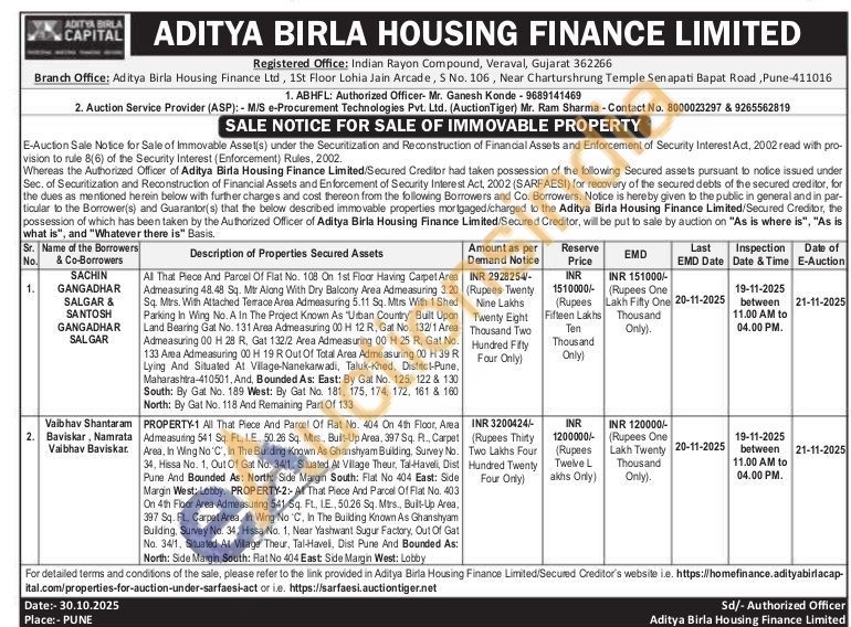 PROPERTY-1 All That Piece And Parcel Of Rat No. 404 On 4th Floor, Area Admeasuring 541 Sq. FL, IE, 50.26 Sq. Mtrs, Bull-Up Area, 397 Sq. R., Carpet Area, In Wing No 'C', In The Building Known As Ghanshyam Building, Survey No. 34. Hissa No. 1, Out Of Gat No. 34/1, Situated At Village Theur, Tal-Haveli, Dist Pune And Bounded As: North: Side Margin South: Flat No 404 East: Side Margin West: Lobby. PROPERTY-2:- All That Plece And Parcel Of Flat No. 403 On 4th Floor Area Admeasuring 541 Sq. FL, IE, 50.26 Sq. Mtrs., Built-Up Area, 397 Sq. Ft, Carpet Area, In Wing No 'C, In The Building Known As Ghanshyam Building, Survey No. 34, Hissa No. 1, Near Yashwant Sugur Factory, Out Of Gat No. 34/1, Situated At Village Theur, Tal-Havell, Dist Pune And Bounded As: North: Side Margin South: Rat No 404 East: Side Margin West: Lobby