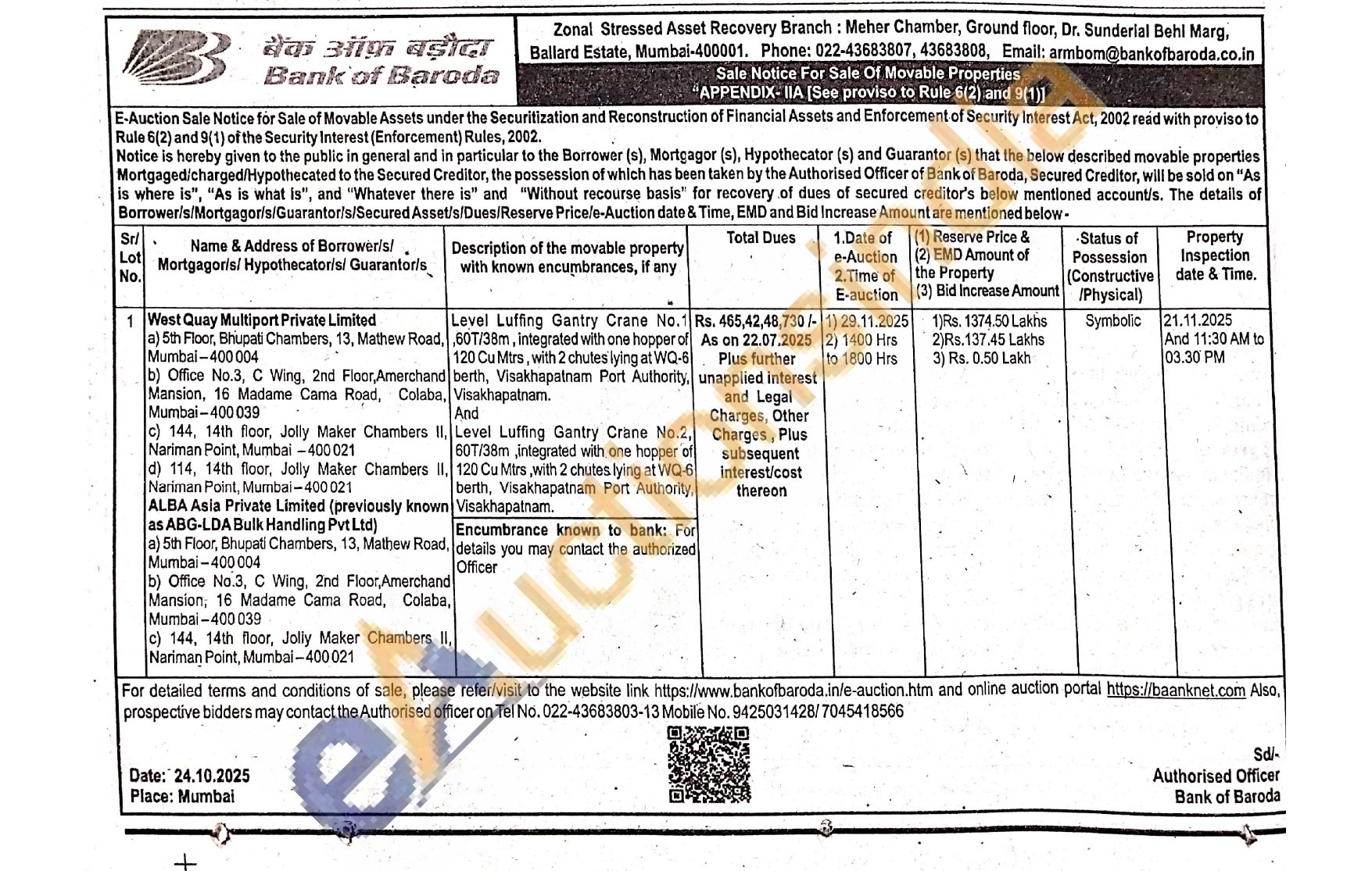 Level Luffing Gantry Crane No.1 60T/38m, integrated with one hopper of 120 Cu Mtrs, with 2 chutes lying at WQ-6 berth, Visakhapatnam Port Authority, Visakhapatnam. And Level Luffing Gantry Crane No.2, 607/38m, integrated with one hopper of 120 Cu Mirs, with 2 chutes lying at WQ-6 berth, Visakhapatnam Port Authority, Visakhapatnam