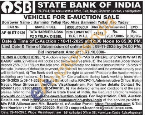 CAR No. AP 40 ET 0126,MAKE/FUEL MODEL/COLOUR -TATA HARRIER A BS6 P2 D FRLR+/DIESEL 2024/LUNWT NCT BLK, 5 IN ALL KMs Run 21978