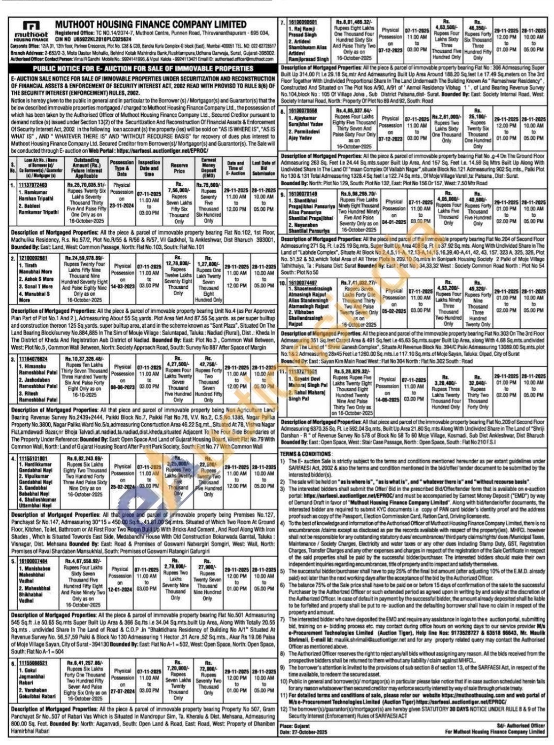 Description of Mortgaged Properties: All the piece & parcel of immovable property bearing Flat No.9-4 On The Ground Floor Admeasuring 263 Sq. Feet le 24.44 Sq.mts super Built Up Area, And 157 Sq. Feet l.e. 14.59 Sq Mtrs Built Up Along With Undivided Share in The Land Of "maan Complex Of Vallabh Nagar", situate Block No.121 Admeasuring 902 Sq.mts, Paiki Plot No 130 & 131 Total Admeasuring 1328.4 Sq. feet le 122.74 Sq.mts, Of Moje Village Varell, ta: Palsana, Dist: Surat Bounded By: North: Plot No 129, South: Plot No 132, East: Plot No 156 Or 157, West: 7.50 Mtr Road
