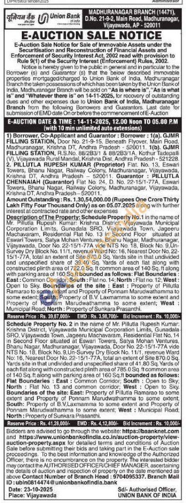 Schedule Property No.1 in the name of Mr. Pillutla Rupesh Kumar: Krishna District, Vijayawada Municipal Corporation Limits, Gunadala SRO, Vijayawada Town, Jageeru Machavaram, Residential Flat No. 13 in Second Floor situated at Eswari Towers, Satya Mohan Ventures, Bhanu Nagar, Madhuranagar, Vijayawada, Door No. 22-15/1-77A vide NTS No. 18, Block No. 9.Un-Survey Dry Block No. 11/1, revenue Ward No: 16, Nearest Door No. 22-15/1-77A, total an extent of Site 870.0 Sq. Yards site in that undivided and unspecified share of 39.40 Sq. Yards of each flat along with constructed plinth area of 722.0 Sq. It common area of 140 Sq. ft along with parking area of 160 Sq ft bounded as follows: Flat Boundaries: East: Common Corridor; South: Flat no. 14; North: Flat no. 12, West: Open to Sky. Boundaries of the site: East: Property of Pillutla Ramarao to some extent and Property of Ponnam Marudwathamma to some extent; South: Property of B.V. Laxmamma to some extent and Property of Ponnam Marudwathamma to some extent; West: Municipal Road North: Property of Sunkara Prasanthi.