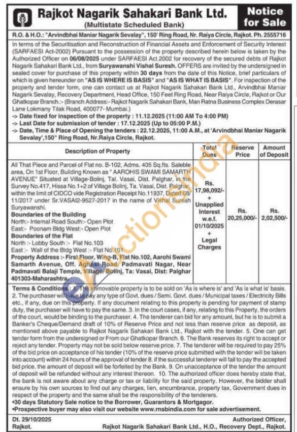All That Piece and Parcel of Flat no. B-102, Adms. 405 Sq.fts. Saleble area, On 1st Floor, Building Known as "AAROHIS SWAMI SAMARTH AVENUE Situated at Village-Bolinj, Tal. Vasai, Dist. Palghar, in the Survey No.417, Hissa No.1+2 of Village Bolinj, Ta. Vasai, Dist. Palghar, within the limit of CIDCO vide Registration Receipt No. 11937, Dated.08/11/2017 under Sr.VASAI2-9527-2017 in the name of Vishal Suresh Suryawanshi.