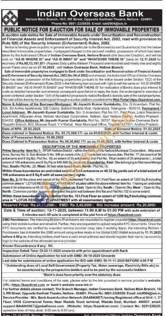 Item No.1: SPSR Nellore District, within the limits of the Nellore Municipal Corporation, Allipuram Area, Survey No. 9, Sub division S.No. 9/B an extent of Ac.3.31 cents laid into layout plan, Plot No. 17 (An extent of 36 ankanams and 8 Sq.fts), Plot No. 18( an extent of 35 ankanams) and Plot No. 19(an extent of 35 ankanams), a total extent of 106 ankanams and 8 Sq. Fits or 848.888 Sq yards sile Bounded by: East: Site belonging to Mannava Manga Rao, South: Plot No. 20, West: 30 feet wide layout Road, North: Plot No. 16. Within these boundaries an undivided extent of 6.04 ankanams or 48.32 Sq.yards out of a total extent of 106 ankanams and 8 Sq.ft with all easemantary rights. Item No. 2: All the piece and parcel of the RCC residential Flat No. 101. First Floor an extent of 1250 Sq.ft including common area in " LOTUS RESIDENCY" APARTMENT situated within the above referred item No. 1 having an undivided share 6.04 ankanams or 48.32 Sq, yards Bounded on: East: Open to Sky, South: Open to Sky, West: Open to Sky, North: Common corridor to some extent and the joint wall between this flat and Flat No. 102 to some extent. Within these boundaries an residential Flat No. 101, First Floor an extent of 1250 Sq.ft including common area in "LOTUS RESIDENCY" APARTMENT with all easemantary rights