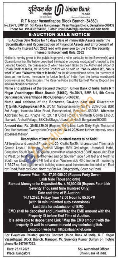 All the piece and parcel of Property No 20. Khatha No 29, 1st cross road, Thimmaiah Gowda Layout, Ittamadu, Arehalli Village, BSK 3rd stage, Uttarahalli Hobli, Bangalore South Taluk, Bangalore, now within jurisdiction of BBMP, measuring East to West: on Northern side 49-0 feet and on Southem side 10-0 feet and North to South: on Eastem side 37-0 feet and on Western side 40-0 feet in all measuring 1135.75 sq. feet together with building constructed there on and bounded on: East by: Road, West by: Road, North by: Site No. 20A property, South by: Road.