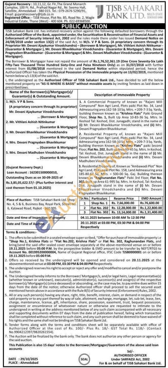 1. A Commercial Property of known as "Rajani Mill Compound" Non Agri Land, Plots paiki Plot No. 34, Land Admeasuring area 162-58-10 Sq. Mtrs. 209-7-3 Sq. Yards, building thereon known as "Krishna Flats" Paiki Ground Floor, Shop No. 1, Built Up Area 10-83-36 Sq. Mtrs. In Keshod Tal: Keshod, Dist. Junagadh; stand in the name of (i) Mr. Devani Bhavikkumar Vinodchandra, and (ii) Mrs. Devani Pragnyaben Bhavikkumar