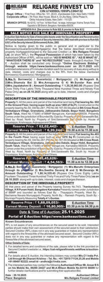 All the piece and parcel of the Industrial land being Flat bearing No.403 in the Fourth Floor having super built-up area 1070 Sq Ft Constructed on the property bearing No. 59. Old No.28/1, PID No.66-187-59, Situated at 8th Cross Road, Venkatapura Village, Gramatana, Jakkasandra Dakale, Begur Hobli, Bangalore South Taluk, Ward No. 173(66) of BBMP Bangalore, Karnataka-560034, Presently Comes under the jurisdiction of Bounded By: East by: Property of Smt. Saraswathi Bai, West by: Road, North by: Property of Smt Saraswathi Bai, South by: House of Gopalappa, Krishnappa, Anjinappa and Others.