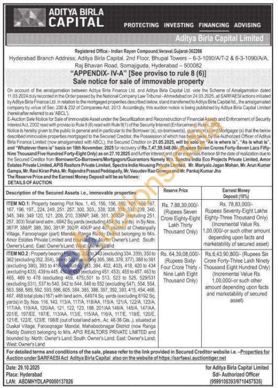 ITEM NO.2: Property bearing Plot Nos. 332 to 343 (excluding 334, 339), 350 to 362 (excluding 352.354), 364 to 382 (excluding 365, 366, 376, 377), 388 to 391 (excluding 380), 383 to 416 (excluding 393, 394, 402, 403), 418, 420 to 434 (excluding 433), 439 to 445, 450 to 453 (excluding 451,453), 455 to 457, 463 to 465, 469 to 478 (excluding 469, 475),501 10 513, 523 525, 529/531 (excluding 531), 537 to 540, 542 to 544, 546 to 552 (excluding 547), 554, 554, 563,588, 589,592,593,596,605,384,385, 386, 387,392,393,415,454,466. 467, 468 total plots (167) with land adm., 64974 Sq, yards (excluding 8192 Sq yards) in Sy. Nos: 116, 143, 113/A, 117/A, 118/ΑΑ, 119/A, 121/Α, 122/Α, 123/Α, 117/AA, 119/AA, 120/AA, 121, 122, 123, 198, 201 AA 146/A, 145/A, 147/AA, 201/Ε. 197/ΕΕ. 197/E, 113/AA. 113/E, 115/AA, 116/A, 117/E, 119/E. 120/E. 121/Ε. 122/E, 123/E 198/E (out of total land adm., Ac. 46-36 Gts.,), situated at Duskal Vilage, Farooqnagar Mandal, Mahaboobnagar District (now Ranga Reddy District) belonging to Mis. APIS REALTORS PRIVATE LIMITED and bounded by: North: Owner's Land, South: Owner's Land, East: Owner's Land, West: Owner's Land