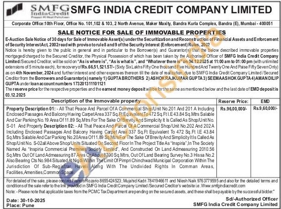 Property Description 01:- All That Peace And Parcel Of A Commercial Shop/Unit No.201 And 201 A Including Enclosed Passages And Balcony Having CarpetArea 337 Sq. Ft Equivalent To 472 Sq. F11.E43.84 Sq.Mirs Salable And Car Parking No. 19 Area Of 11.89 Sq.Mtrs For The Sake Of Brevity And Simplicity It Is Called As Shop/Unit No. S-01 And Property Description 02:- Al That Peace And Parcel Of A Commercial Shop/Unit No.202 And 202 A Including Enclosed Passages And Balcony Having Carpet Area 337 Sq. Ft Equivalent To 472 Sq.Ft IE 43.84 Sq. Mirs Salable And Car Parking No.20Area Of11.89 Sq.Mtrs For The Sake Of Brevity And Simplicity Itis Called As Shop/Unit No. S-02all Above Shop/Units Situated On Second Floor In The Project Title As "Inspiria", In The Society Named As "Inspiria Commercial Premises Society Limited, And Constructed On Land Admeasuring 2010.56 Sq.Mirs Out Of Land Admeasuring 87 Ares Or About 8700 Sq.Mtrs, Out Of Land Bearing Survey No.3 Hissa No.2 Also Bearing Cts No.984 Situated At Nigdi Within The Limit Of Pimpri Chinchwad Municipal Corporation Within The Jurisdiction Of Sub-Registrar Haveli Along With The Undivided Rights In Comman Areas, Facilites, Amenites, Common Space