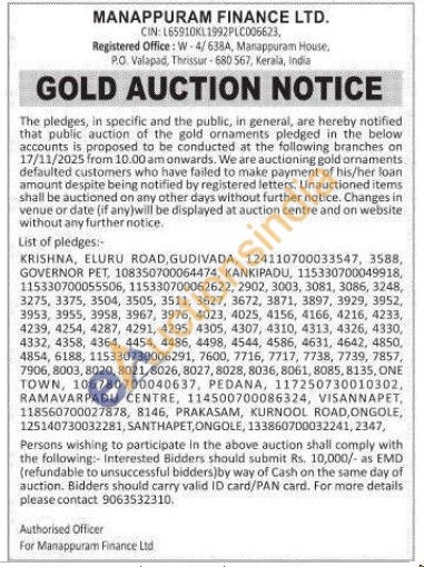 Manappuram Finance Ltd Gold Auctions Auction in Krishna