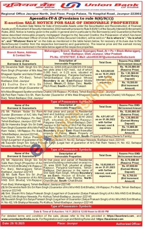 All that piece and parcel of Residential land and building constructed on arazino19, area 3500 Sqft, situated at village-Rajepur, Pargana-Garhwara, Tehsil-Badlapur, Dist-Jaunpur in the name of Shri Salik Ram Singh, Whose Boundary is as: East House of Bhulai and Devendra, West- Aam Rashta, North-Chak Bhulai, South-Chak Bhulai