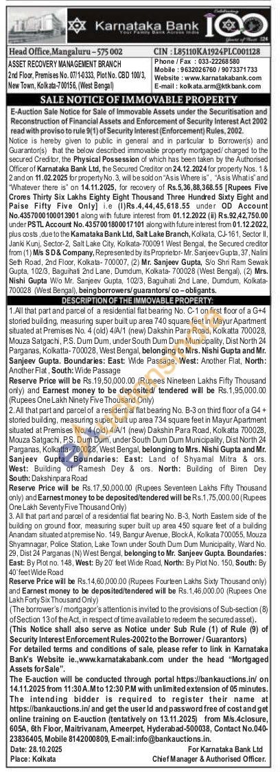 All that part and parcel of a residential flat bearing No. C-1 on first floor of a G+4 storied building, measuring super built up area 740 square feet in Mayur Apartment situated at Premises No. 4 (old) 4/A/1 (new) Dakshin Para Road, Kolkatta 700028, Mouza Satgach, P.S. Dum Dum, under South Dum Dum Municipality, Dist North 24 Parganas, Kolkatta-700028, West Bengal, belonging to Mrs. Nishi Gupta and Mr. Sanjeev Gupta. Boundaries: East: Wide Passage, West: Another Flat, North: Another Flat, South: Wide Passage