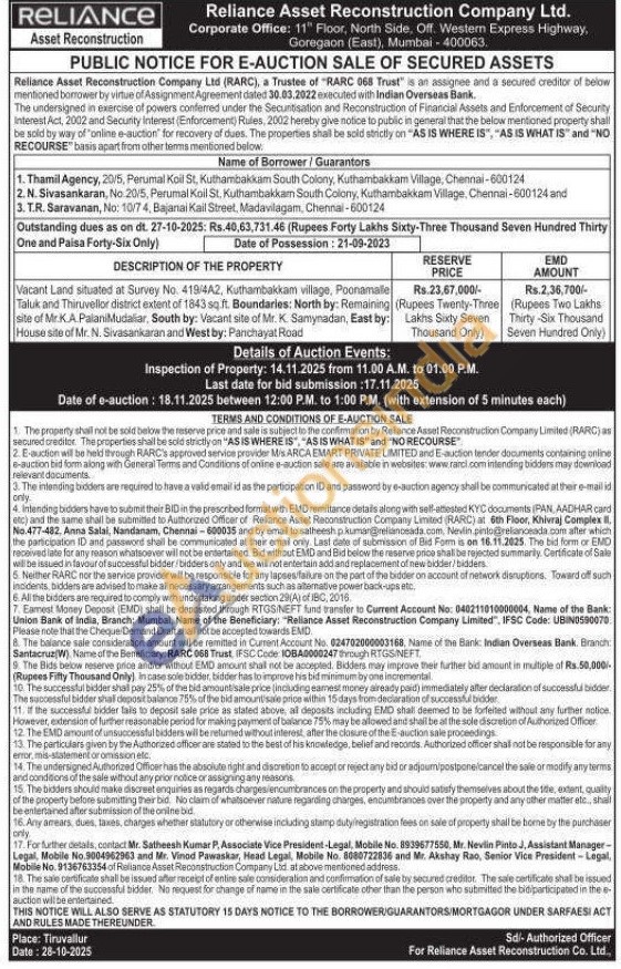 Vacant Land situated at Survey No. 419/4A2, Kuthambakkam village, Poonamalle Taluk and Thiruvellor district extent of 1843 sq.ft. Boundaries: North by:Remaining site of Mr.K.A.Palani Mudaliar, South by: Vacant site of Mr. K. Samynadan, East by: House site of Mr. N. Sivasankaran and West by: Panchayat Road